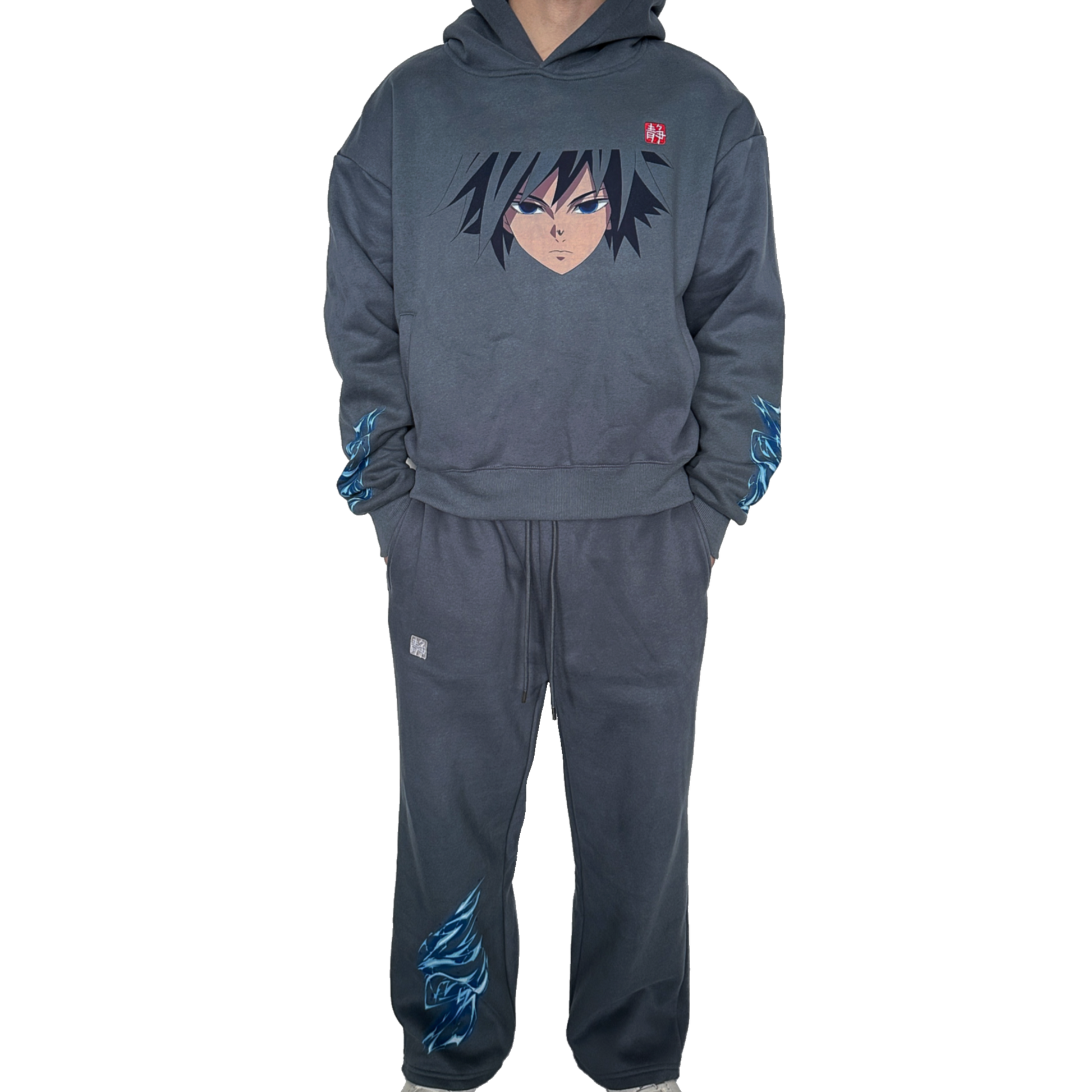 baggy wide sweatpants in dusty blue-gray. heavyweight and fully fleece lined. relaxed-fit, mid-rise. two-pocket styling. drawstring at elasticized waistband. printed graphic at front.