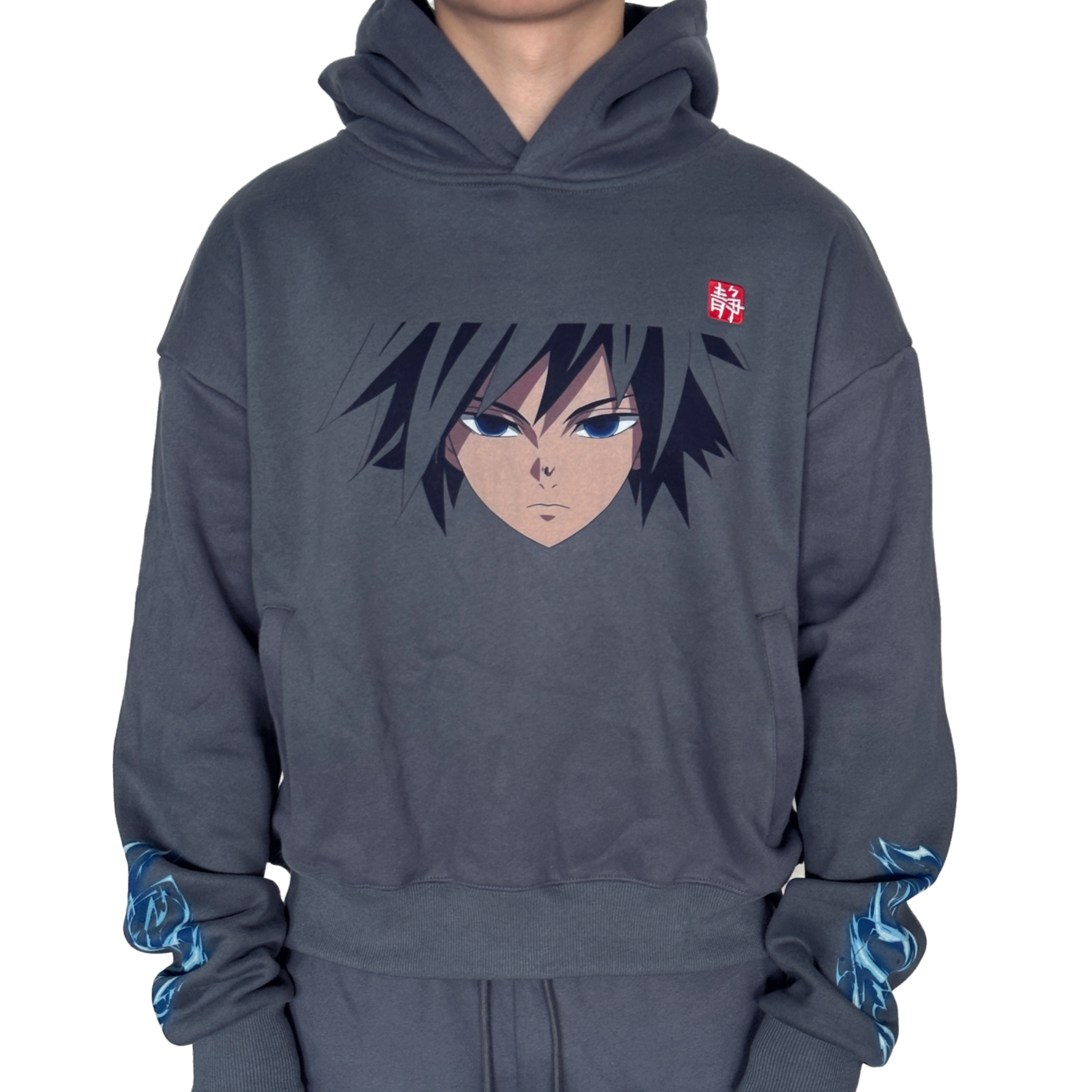 boxy slightly cropped hoodie in dusty blue-gray. heavyweight and fully fleece lined. printed graphic at front and sleeves. embroidered logo at chest. welt pockets. rib knit cuffs and hem.