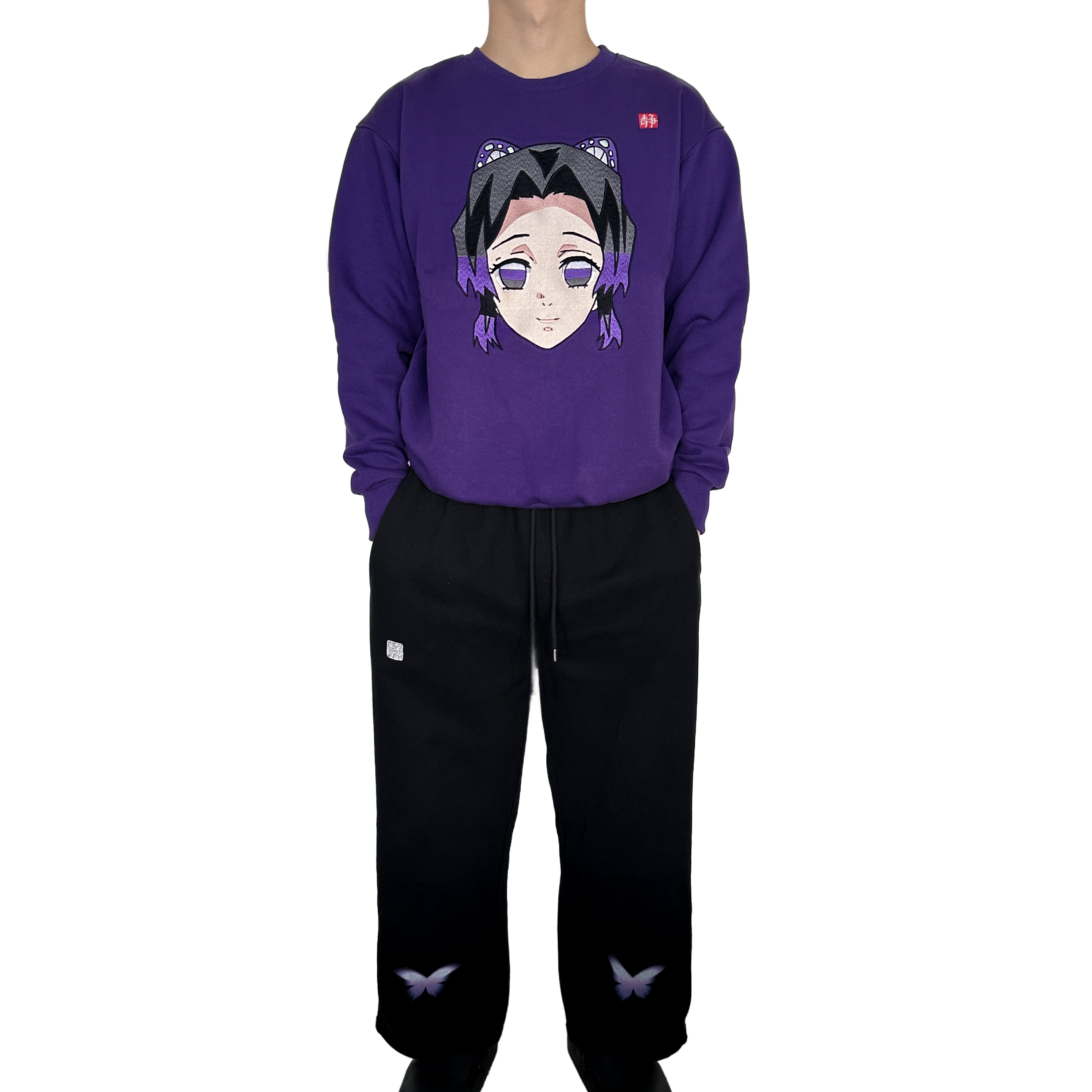 oversized long sleeve fleece lined crewneck sweatshirt in deep purple. graphic and logo embroidered at front.