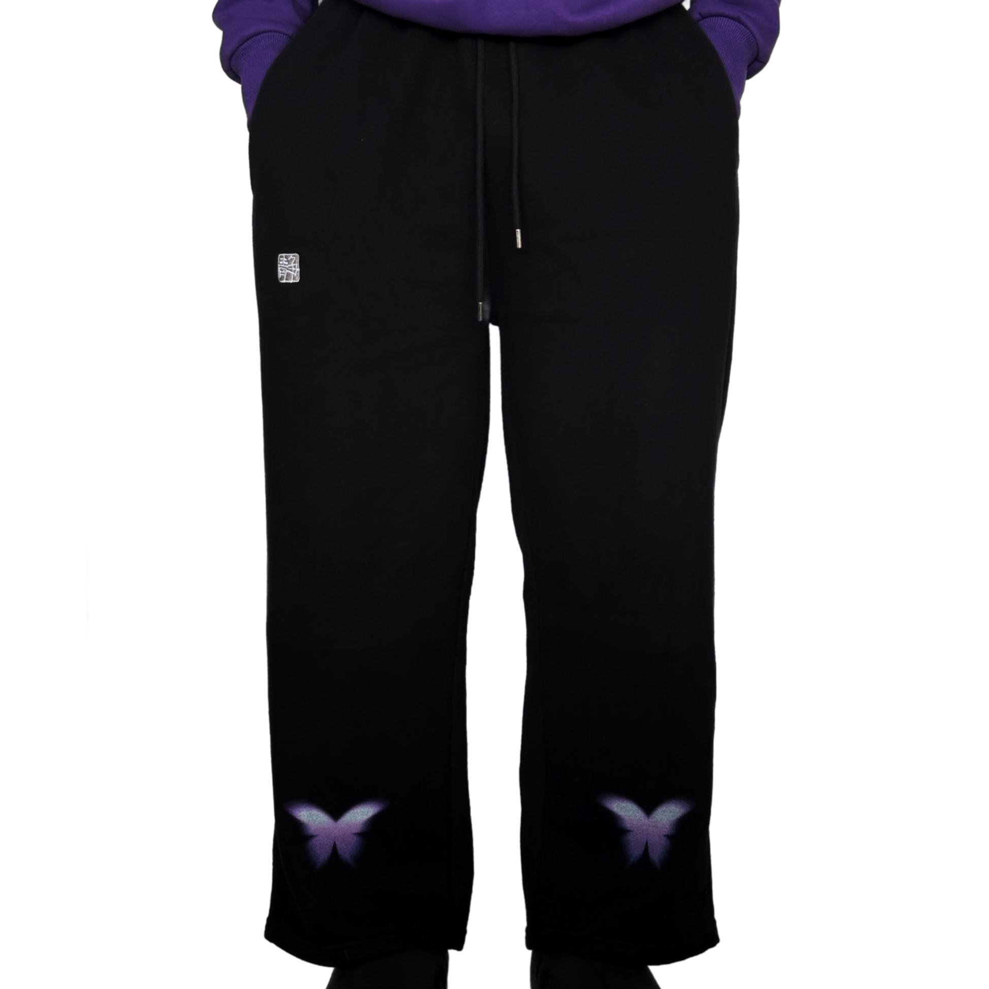 baggy wide sweatpants in black. heavyweight and fully fleece lined. relaxed-fit, mid-rise. two-pocket styling. drawstring at elasticized waistband. printed graphic at front.